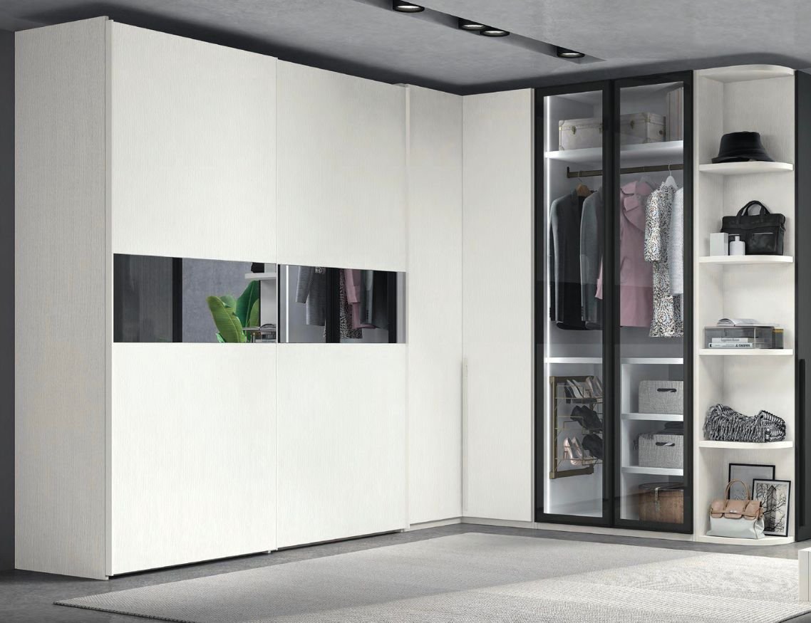Armario compuesto por: armario de dos puertas correderas, armario rincón de dos puertas, dos puertas abatibles de cristal y terminal zapatero de estantes vistos con puerta de interior de estantes. Medidas: 306,2X252,9X240X60 cm.