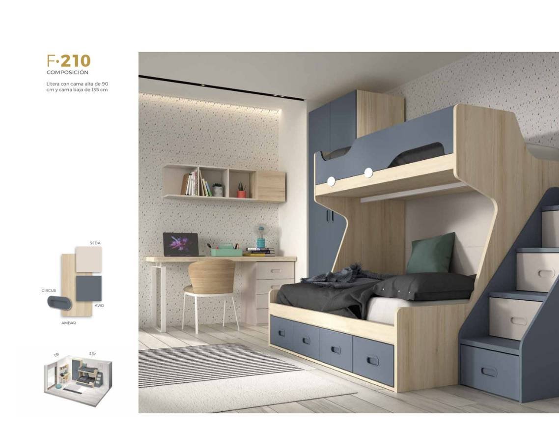 Cama litera juvenil con cama superior para colchón de 90 x 190 cm y cama inferior con posibilidad de elegir la cama para colchón de 105 x 190 cm o 135 x 190 cm con escalera de 3 puertas y 1 contenedor.