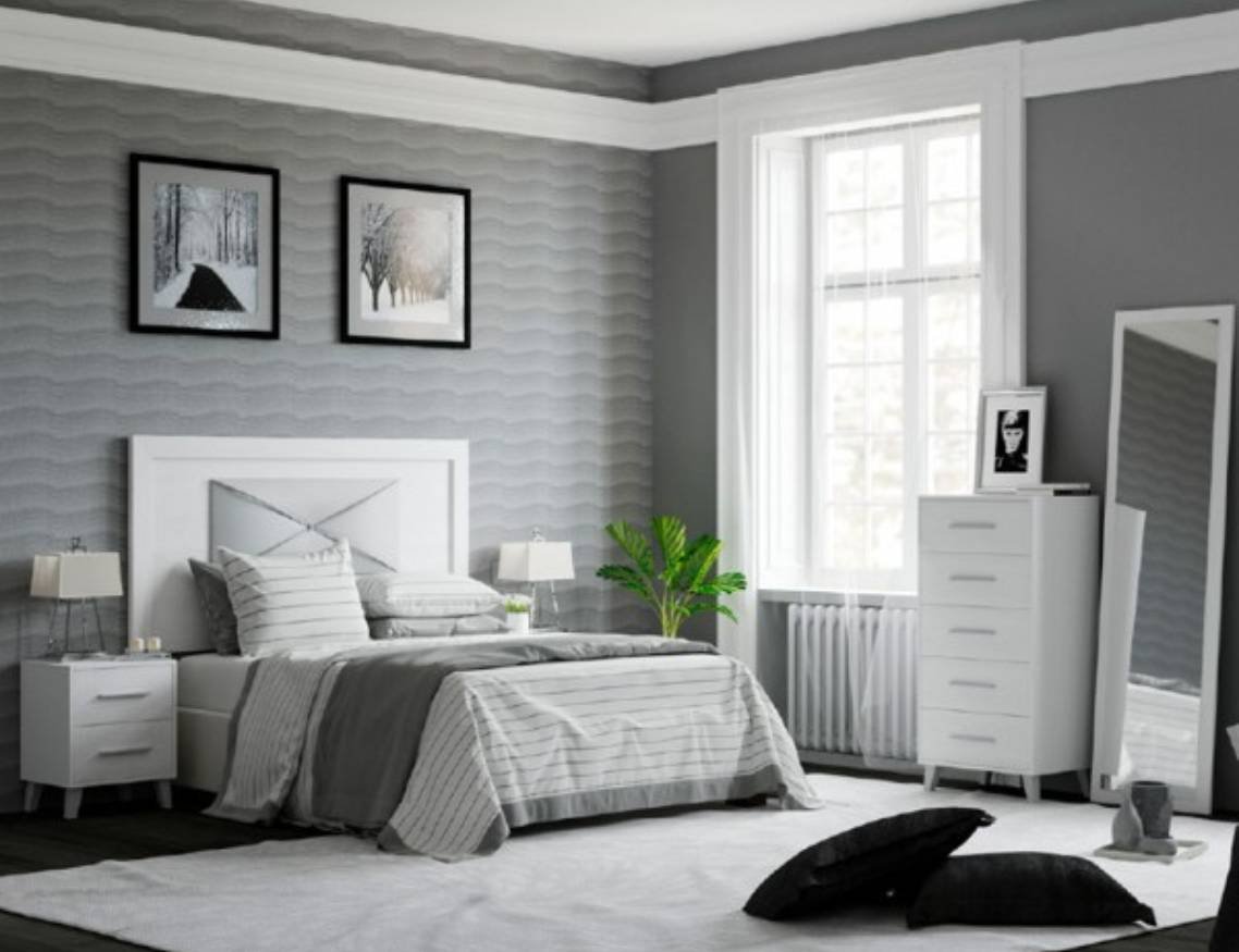 Dormitorio modelo Puzzle 29. Compuesto por un cabecero, dos mesitas de 2 cajones, un sinfonier de 5 cajones y un espejo de pie. Es de color nieve con tiradores y patas en plata pero puedes pedirlo de color roble y tiradores y patas en blanco si quieres.