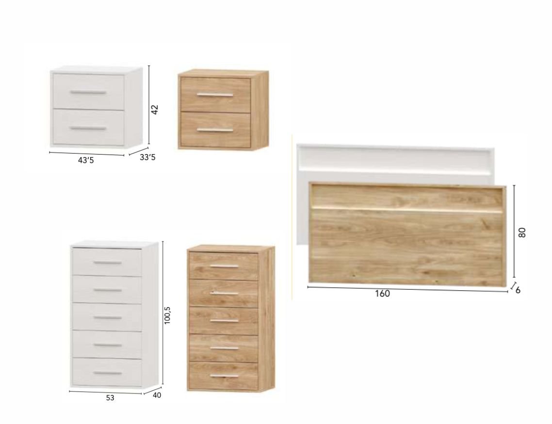 El dormitorio puzzle 08 destaca por tener un estilo sencillo y minimalista. Incluye el cabecero, las dos mesitas de noche de dos cajones y dos sinfonier de 5 cajones. Mueble premontado.