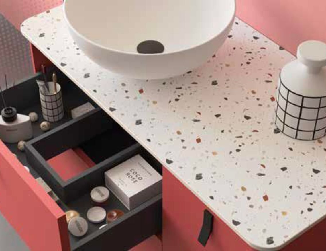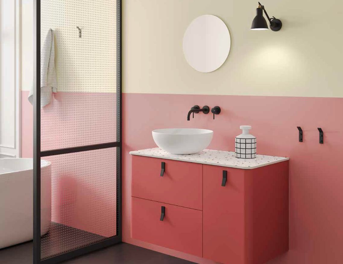 Dale vida a tu baño con una gama de 18 colores lacados mate. Diseño con esquinas curvas y lavabos y encimeras que se adaptan perfectamente.