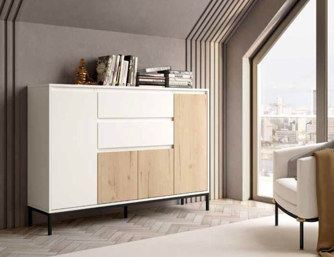 Se trata de un aparador moderno con líneas rectas donde la variedad de sus patas realzan los muebles dándoles un toque más contemporáneo.