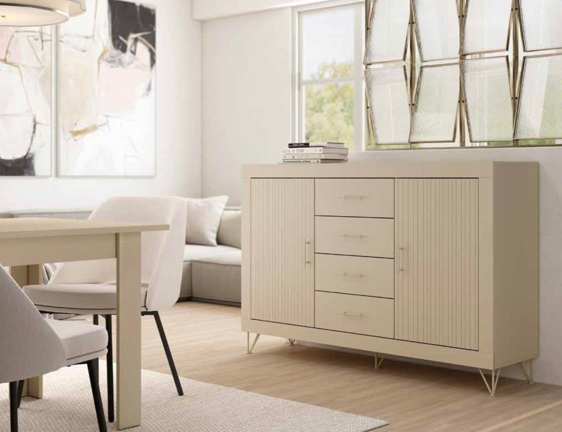 Aparador compuesto de un modulo dos puertas puertas y cajones. Fabricado con tableros melamínicos de alta resistencia. Dispones de estantes interiores fijos y con bisagras metálicas de gran calidad , los cajones van terminados en textil con guías metal de rueda.