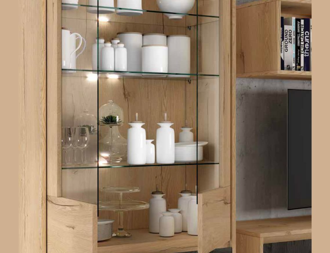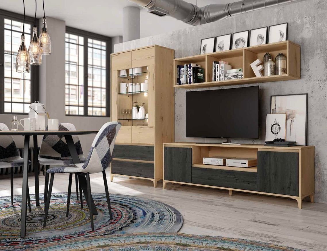 Conjunto de salón formado por un mueble de TV con tres puertas y una huecos, una vitrina con luz led interior con dos puertas y dos cajones.