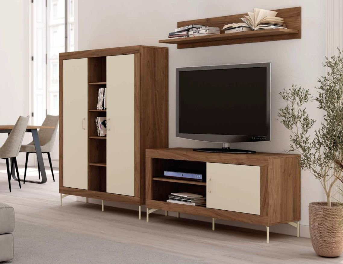 Composición salón con bodeguero, mueble TV y estante. Acabado en color java combinado con perla.
