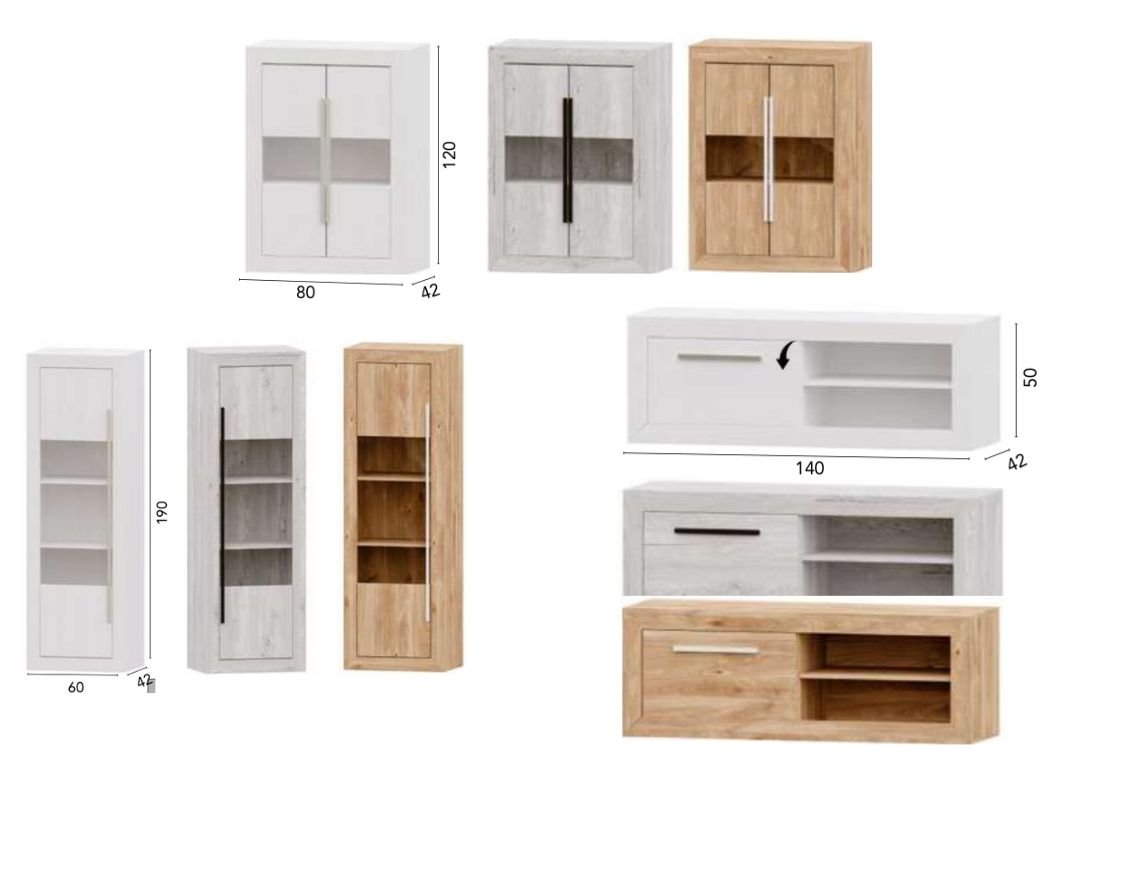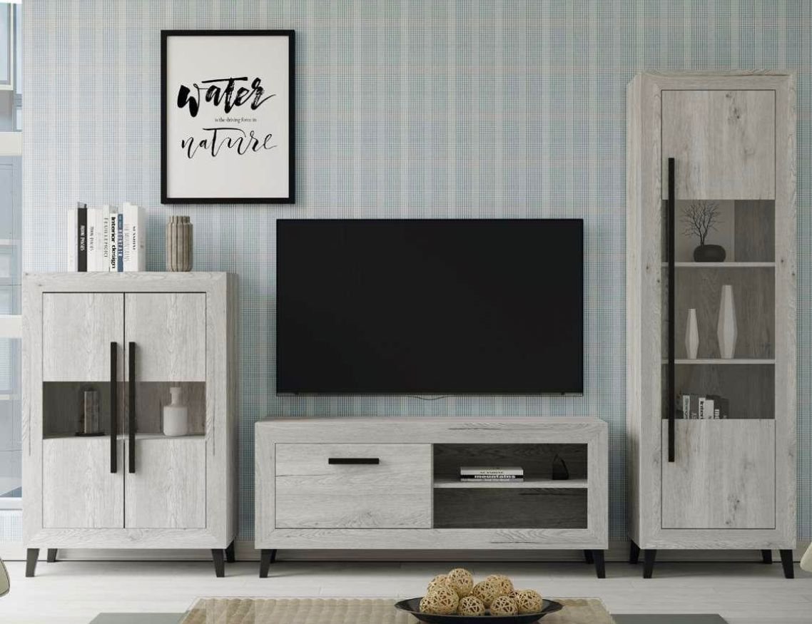 Moderna composición de salón compuesta por dos vitrinas auxiliares a un mueble de TV central con cajoneras y estantes interiores.