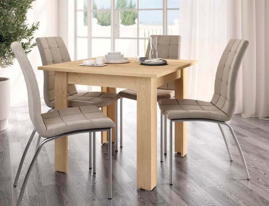 Este modelo es una mesa fija, con un sobre de 90 x 90 cm, ideal para comedores pequeños o con poco espacio que no necesitan una gran mesa extensible. Está disponible en 5 colores y puedes combinarla con el resto de muebles de su colección.