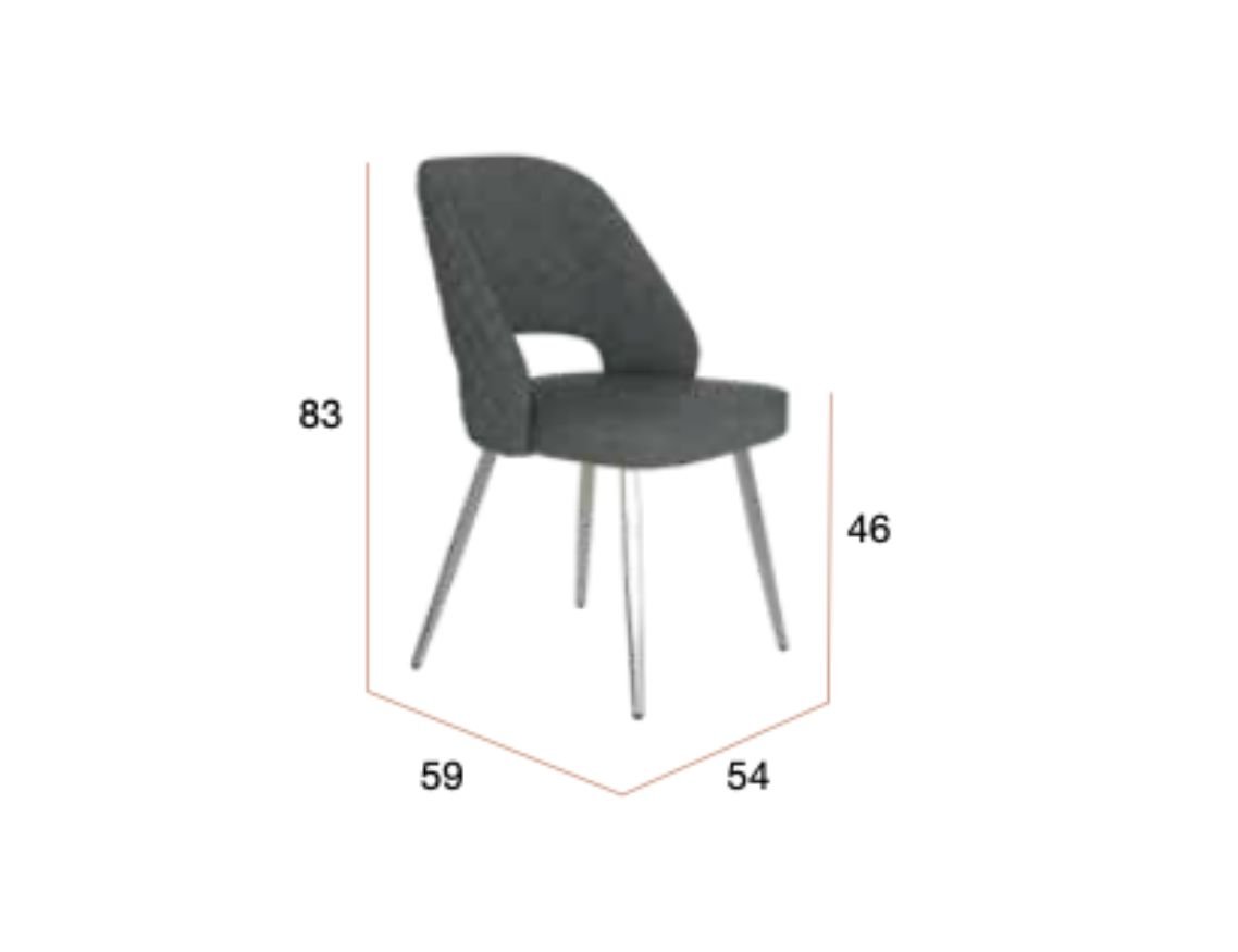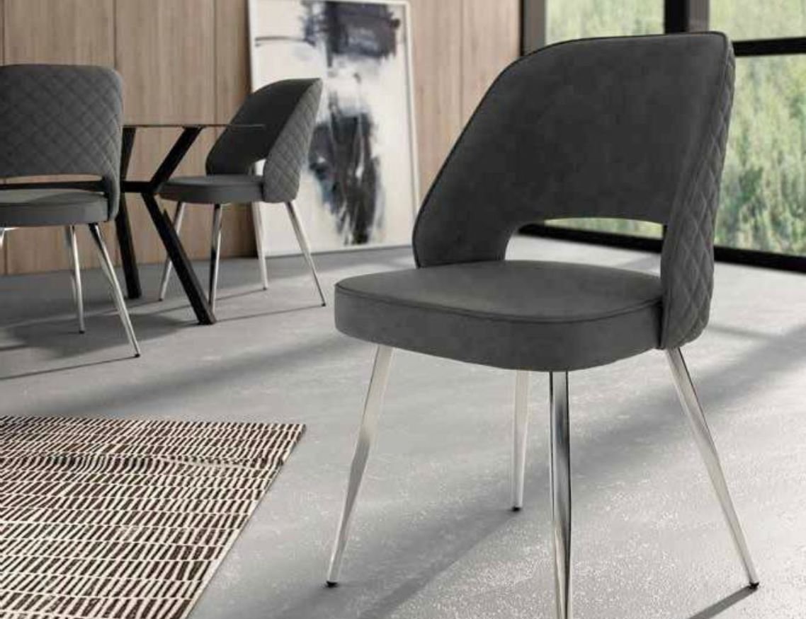 Precioso juego de sillas. Sillas con asiento y respaldo tapizados y patas metálicas. Disponible en tres colores: perla, crema y marengo.