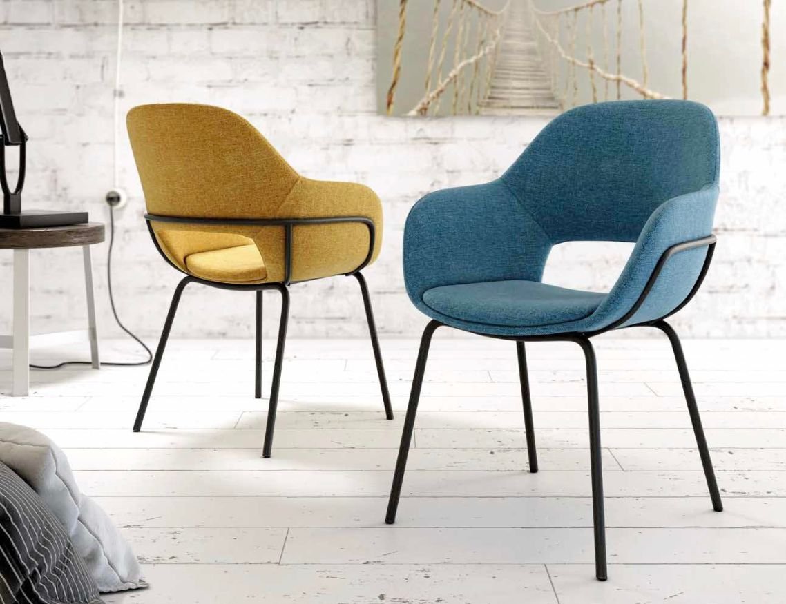 ¡Esta silla tiene un estilo único! Silla con asiento y respaldo tapizados. Patas de metal negras. Disponible en cuatro colores.