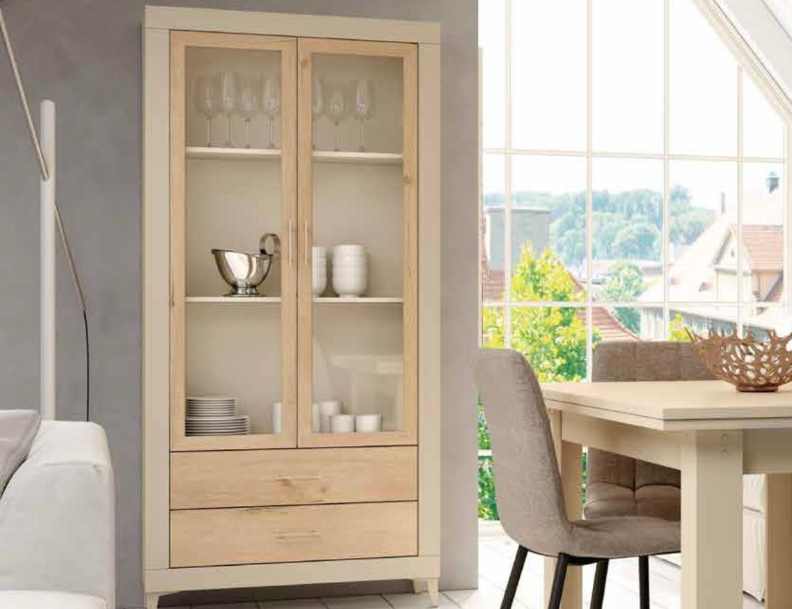 Esta vitrina alta cuenta con dos puertas y dos cajones amplios que te ofrecen mucho espacio de almacenamiento. Además, su diseño abierto y sus aires minimalistas hacen que sea la opción ideal para cualquier tipo de decoración. Sus molduras anchas añaden carácter y personalidad a este mueble, convirtiéndolo en el centro de atención de cualquier habitación.