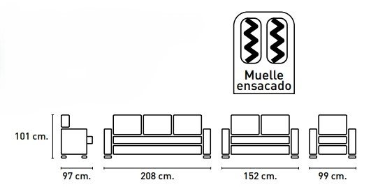 El sistema se acciona de manera independiente mediante una sencilla palanca en el lateral de cada plaza excepto en el sofá de 3 plazas que es fija la del medio. La sentada es comodísima y además se mantendrá firme firme durante mucho tiempo gracias a su sistema de muelles ensacados.